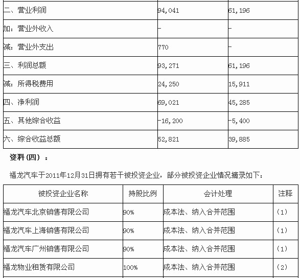 (1)福龙汽车北京销售有限公司(以下简称北京公司)、福龙汽车上海销售有限公司(以下简称上海公司)和福龙汽车广州销售有限公司(以下简称广州公司)2011年度的营业收入分别占福龙汽车合并营业收入的40%、30%和20%。