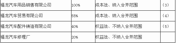 (4)福龙汽车贸易有限公司(以下简称贸易公司)是福龙汽车于2011年12月与昌德公司(非关联方)共同投资设立的,注册资本和实收资本均为1000万元,其中福龙汽车出资550万元,持股55%;昌德公司出资450万元,持股45%。根据投资协议和贸易公司的章程,投资双方分别委派1名董事参与贸易公司的经营,贸易公司所有重大财务和经营决策须经全体董事一致同意方可通过。截至2011年12月31日,贸易公司除发生10万元开办费外,未发生其他交易。