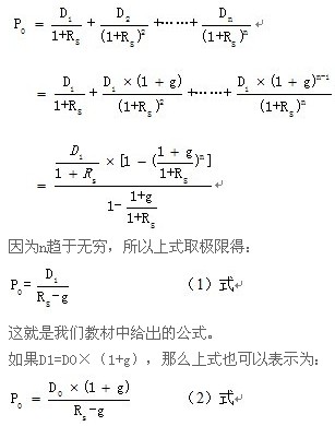 【提示2】对于具体题目,通常情况下使用(1)式或(2)式计算都可以。但并不是所有题目中都可以用(2)式计算,如果D1不是按照固定增长率g增长,则不能用(2)式计算,只能用(1)式计算。