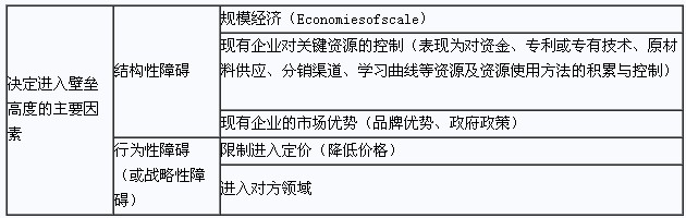 进入威胁的大小取决于呈现的进入障碍(结构性障碍)与准备进入者可能遇到的现有在位者的反击(行为性障碍),统称为进入障碍。