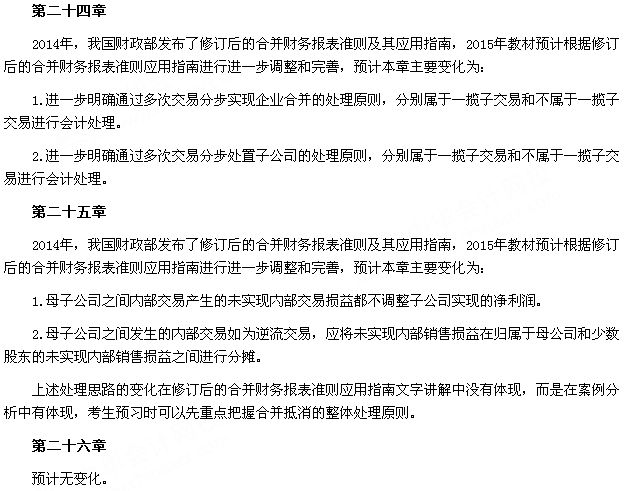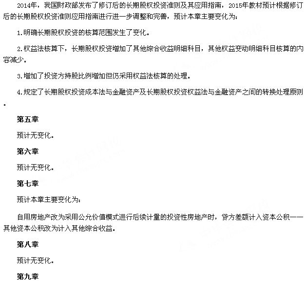 2015年注册会计师考试教材暂未公布,考试大纲及教材内容变化均为公布,2015年注册会计师考试报名时间为3月30日-4月30日,考生备考时间越来越少,最近根据众学员咨询教材变化情况,环球网校因此对2015年注册会计师考试各个科目的考试教材变化进行预测,以下是2015年注册会计师考试《会计》教材变化预测,仅供参考,请已官方公布为准