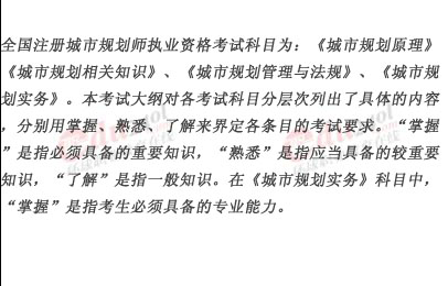《城市规划原理》作为一门理论性考试科目,内容是关于城市与城市发展的知识,城乡规划学科知识,城乡规划体系知识,城市用地与空间布局形成的知识,城乡规划编制的知识,城乡规划实施的知识。本科目考试的目的是:考核应试人员所具备的城乡规划理论知识的状况,包括对城市发展及城市规划学科的基础理论,对城乡规划制定、编制、实施等有关的专业理论的了解、熟悉、掌握程度。