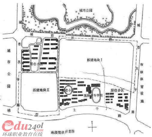 3、处理好与城市公园(1)、市级体育设施(l)及城市干路沿线(1)的关系。(3分)
