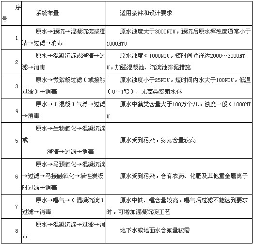 自来水厂净水处理的目的是去除原水中的悬浮物质、胶体物质、细菌、藻类等物质,在特殊情况下,还要去除原水中的铁、锤、氟及某些污染物,使净化后的水质满足生活饮用水水质要求。针对不同的处理要求,可采用不同的工艺流程,其系统布置和适用条件设计要求参见表