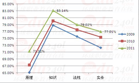 通过对学员的回访数据的统计,得出网校2011年城市规划师辅导各科的通过率情况如下: