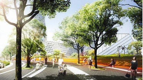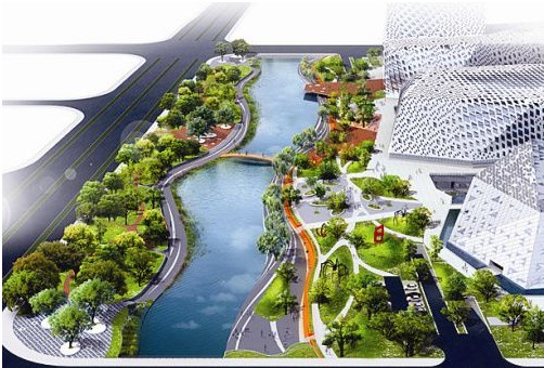 ▲两条横向的文化景观带将腊山河景观轴与三馆文化轴贯穿为一体,增强了人文景观与三馆建筑群间的联系。