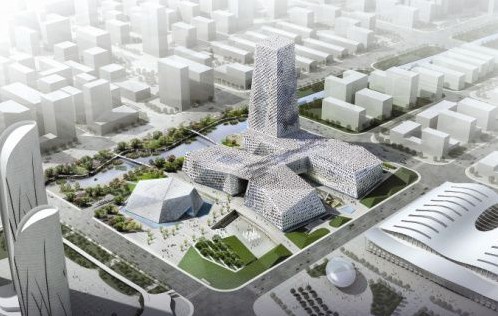 三馆的各个功能建筑被作为一个整体体量进行设计。腊山河是地块内重要的自然景观元素,建筑体量沿东西向被分成三块,由此形成两条通道,将自然的景观延伸到基地的另一侧。基地南侧为大剧院,东侧为会展中心,因此建筑在东南方向向内退以形成广场,并与会展中心的广场互相呼应。一条北向的轴线从建筑中间贯穿,形成主要的公共空间,并与入口广场相结合,成为联系各个功能建筑的一条主要流线。