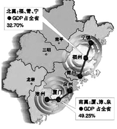 位于福建南部的厦漳泉和北边的福州、莆田、宁德被称为同城化的“南北两翼”,其中厦漳泉先走一步,已提出开通城际公交、电话区号统一、取消漫游、银行手续费降低等具体措施。