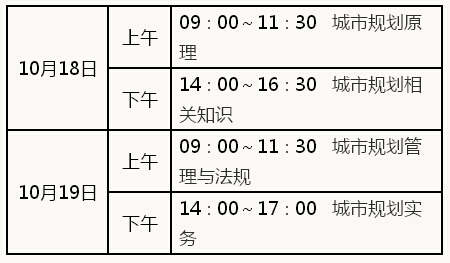 2014年度注册城市规划师执业资格考试定于10月18-19日(星期六、日)两天进行,考试安排和科目如下:
