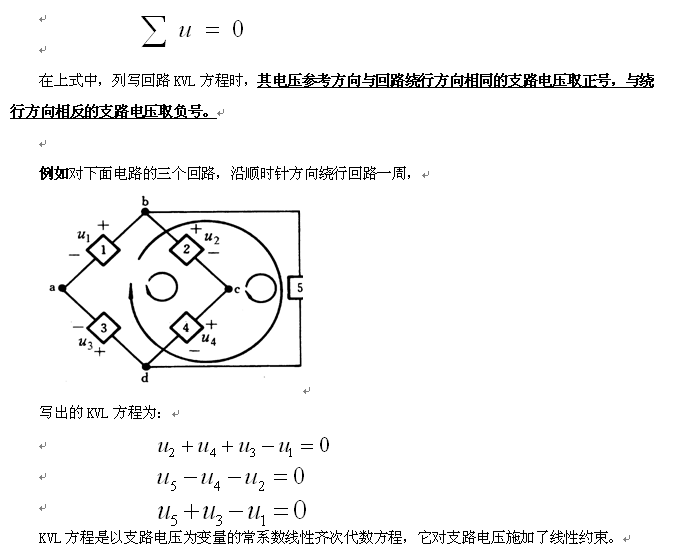 对于任何集总参数电路的任一回路,在任一时刻,沿该回路全部支路电压的代数和等于零,其数学表达式为