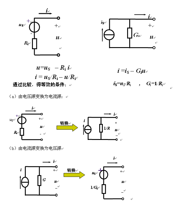(a)变换关系:数值关系: iS=uS /Ri;Gi=1/Ri,方向:电流源电流方向与电压源电压方向相反。