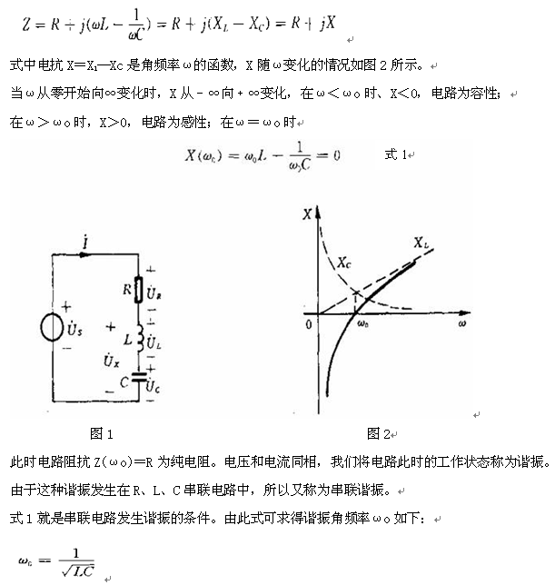 谐振是由R、L、C元件组成的电路在一定条件下发生的一种特殊现象。首先,我们来分析R、L、C串联电路发生谐振的条件和谐振时电路的特性。图1所示R、L、C串联电路,在正弦电压U作用下,其复阻抗为: