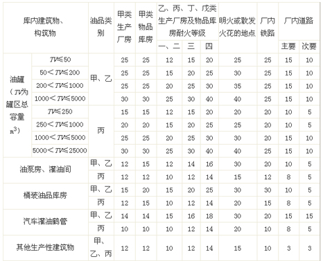 注2:对于埋地卧式油罐和储存丙B类油品的油罐,本表距离(与厂内次要道路的距离除外)可减少50%,但不得小于10m。