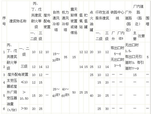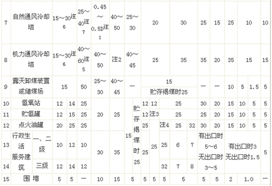 注6:自然通风冷却塔(机力通风冷却塔)与主控制楼,单元控制楼、计算机室等建筑物采用30m,其余建、构筑物均采用15m~20m(除水工设施等采用15m外,其他均采用20m)。