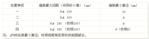 2) 二级框架柱的箍筋直径不小于10mm且箍筋肢距不大于200mm时,除柱根外最大间距应允许采用150mm;三级框架柱的截面尺寸不大于400mm时,箍筋最小直径应允许采用6mm;四级框架柱剪跨比不大于2时,箍筋直径不应小于8mm。