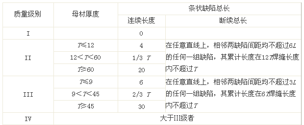 注2:当被检焊缝长度小于12T(II级)或6T(III级)时,可按被检焊缝长度与12T (Ⅱ级)或6T(Ⅲ级)的比例折算出被检焊缝长度内条状缺陷的允许值。当折算的条状缺陷总长度小于单个条状缺陷长度时,以单个条状缺陷长度为允许值。