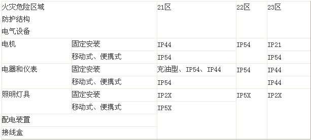 注:①在火灾危险环境21区内固定安装的正常运行时有滑环等火花部件的电机,不宜采用IP44结构。