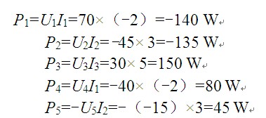 因为P1<0、P2<0,故元件1、2为电源;P3>0、P4>0、P5>0,故元件3、4、5为负载。