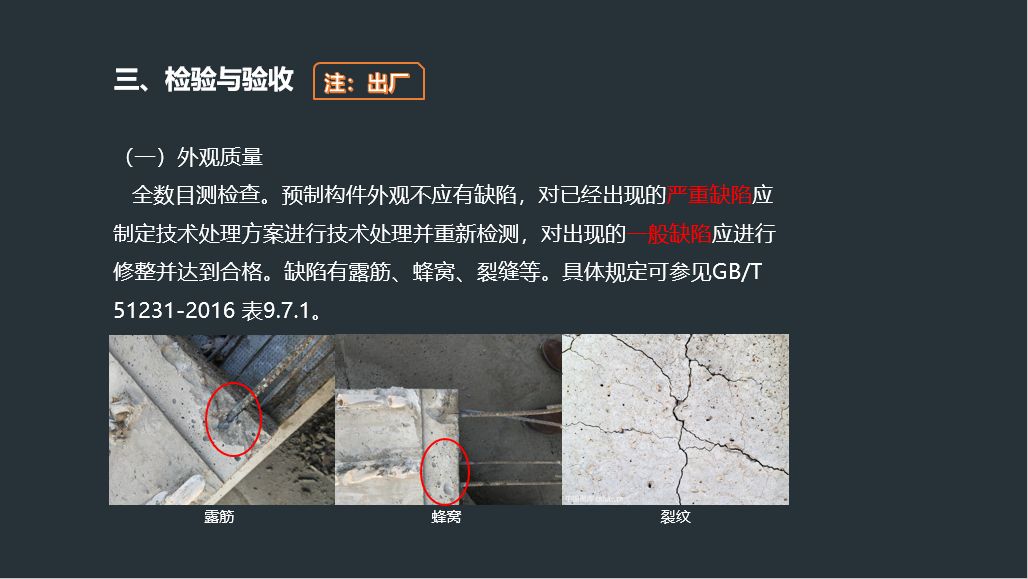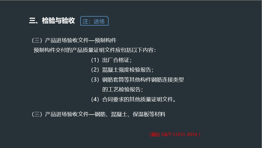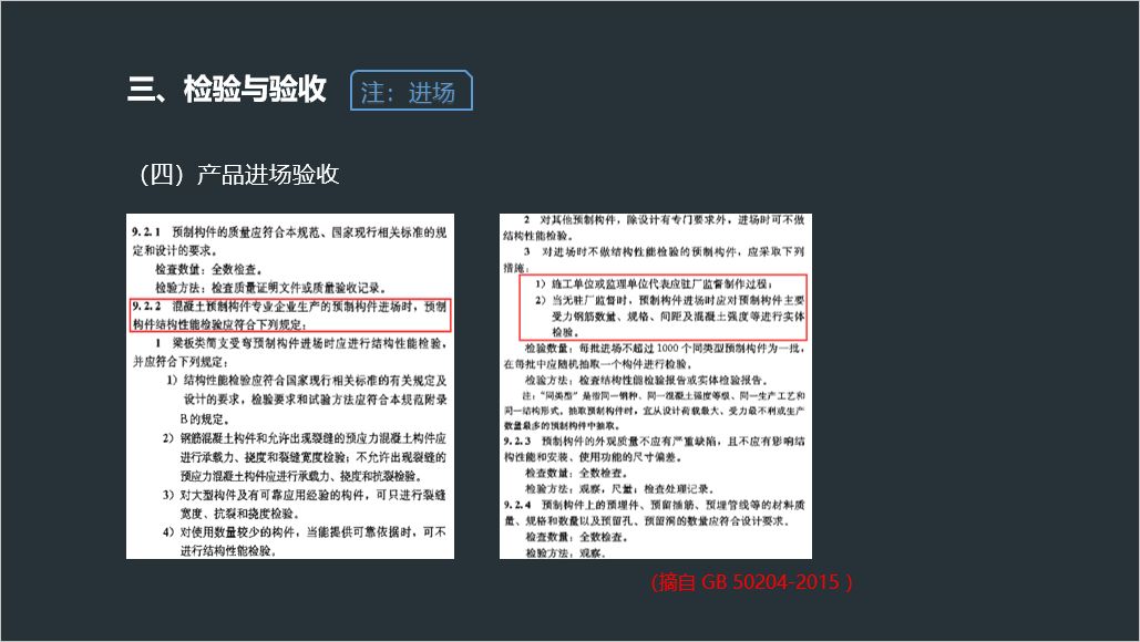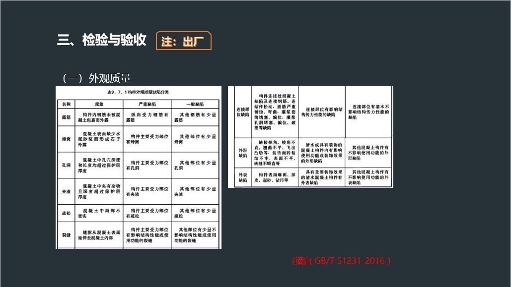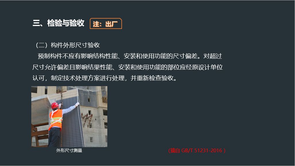 注:本文依据现行国家、行业及地方标准,对预制构件生产、成品构件出厂、运输堆放、现场施工等流程中涉及的检验与验收项目进行了说明和解读,包括材料、数量、批次、工具、允许偏差及有关文件等内容。