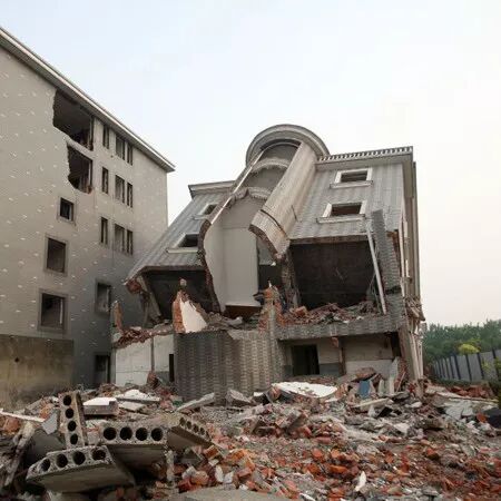 2015年5月8日,杭州城东一城中村拆迁工地,一栋三层楼一楼几乎“连根”断掉,整栋楼倾倒,二三层楼依然完好,网友戏称该楼为“楼坚强”。