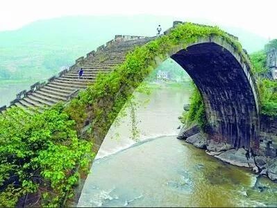 据民国《达县县志》记载:唐代以来,这里是沟通达县、开江、万县、梁平线的要道,明代建有铁索桥。拱桥建于清同治7年(1866年),为单拱大跨度飞架石桥,桥长45米,高27米,面宽10.3米,均用青石砌成半圆形拱。从桥头上拱顶,两端共有石梯76级,坡度六十五度。桥两侧石栏高1米,为糯米和石灰拌浆交错相连,至拱顶化为弧形。拱顶桥面呈瓦背形,宽9米,长6米。桥两头的引桥是用石板铺成的8×9的平坝。桥下原有铜钟一对,每遇风吹,嗡嗡长鸣,数里可闻。