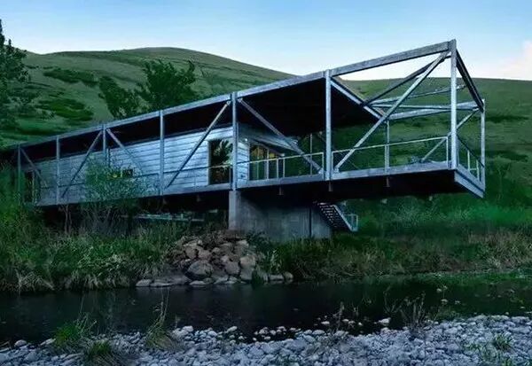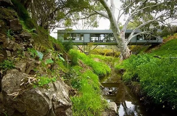 Bridge House的设计旨在轻轻触碰地球。作为一个跨越小溪的狭窄的桥状结构,该项目形成了在树木中生活的体验,黑色混凝土,穿孔钢百叶窗和玻璃窗。