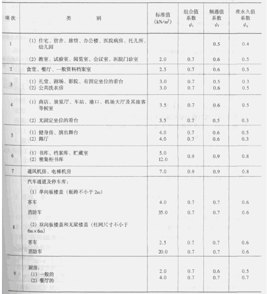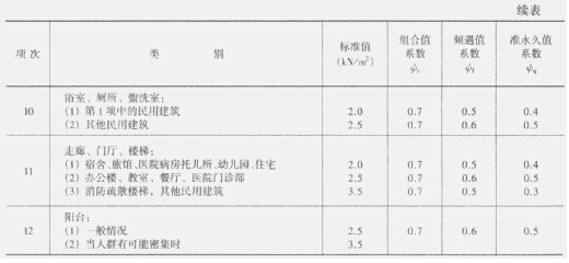 《荷载规范》规定的民用建筑楼面均布活荷载标准值及其组合值、频遇值、准永久值系数如表1-2所列。