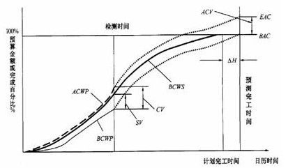 采用赢得值法进行费用、进度综合控制,还可以根据当前的进度、费用偏差情况,通过原因分析,对趋势进行预测,预测项目结束时的进度、费用情况。图中: