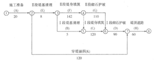 【解析】本案例第1问主要考查施工网络计划图的绘制、工期计算及关键线路的判定。设计变更后,按先“Ⅱ堤段”、后“I堤段”顺序组织施工,其他工作逻辑关系不变,各项工作持续时间不变,绘制新的施工网络计划图。原计划工期为:20+5+120+142+110+60=457(天),新计划的工期为:20+8+142+120+90+60=440(天),新计划的关键线路即工期最长的线路,所以关键线路为:A→E→F→C→D→H。