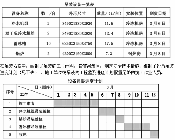 某建筑空调工程中的冷热源主要设备由某施工单位吊装就位,设备需吊装到地下一层(-7.5m) ,再牵引至冷冻机房和锅炉房就位。施工单位依据设备一览表(见下表)及施工现场条件(混凝土地坪)等技术参数进行分析、比较,制定了设备吊装施工方案,方案中选用 KMK6200 汽车式起重机,起重机在工作半径 19m、吊杆伸长 44.2m 时,允许载荷为 21.5t,满足设备的吊装要求。锅炉房的泄爆口尺寸为 9000mm×4000mm,大于所有设备外形尺寸,设置锅炉房泄爆口为设备的吊装口,所有设备经该吊装口吊入,冷水机组和蓄冰槽需用卷扬机牵引到冷冻机房就位。