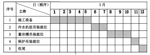 纠正为:施工准备--冷水机组吊装就位--蓄冰槽吊装就位--锅炉吊装就位--收尾新的设备吊装进度计划如下表。
