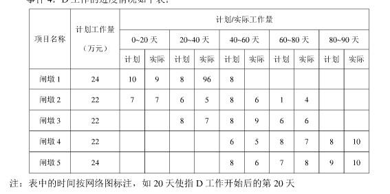 3.根据事件4,计算D工作在第60天末,计划应完成的累积工作量(万元),实际已完成的累积工作量(万元),分别占D工作计划总工作量的百分比;实际比计划超额(或拖欠)工作量占D工作计划总工作量的百分比。