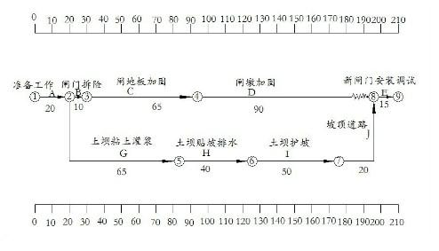 某水库除险加固工程内容有:(1)溢洪道的闸墩与底板加固,闸门更换;(2土坝粘土灌浆、贴坡排水、护坡和坝顶道路重建。施工项目根据合同工期、设备、人员、场地等具体情况编制了施工总进度计划,形成的时标网络图如下(单位:天)
