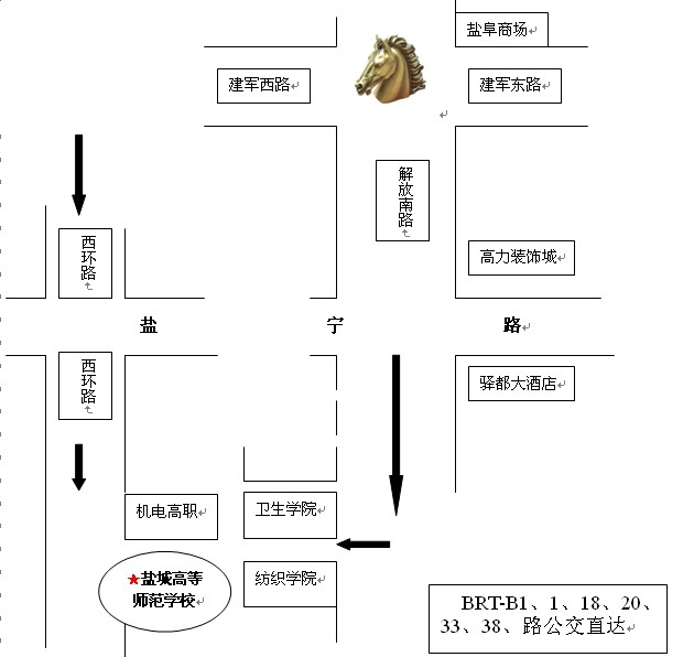 ②市区乘BRT-B1、1路、18路、33路公交车在盐城高等师范学校(盐城机电高职)站下车;