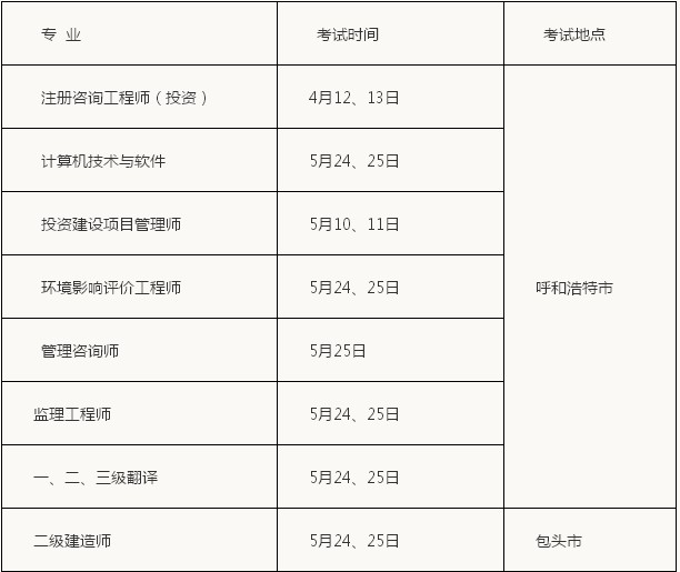 根据内蒙古自治区人事考试中心《关于做好2014年度注册咨询工程师(投资)、计算机技术与软件资格考试、二级建造师执业资格考试考务工作的通知》(内人考函[2014]1号)和《关于做好2014年投资建设项目管理师、管理咨询师、监理工程师、环境影响评价工程师、翻译资格(水平)等考试报名及考务工作的通知》(内人考函[2014]2号)文件精神,为做好我市2014年度上半年部分专业技术资格考试报名及考务工作,现将有关事宜通知如下: