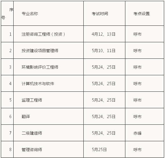 根据内蒙古自治区人事考试中心《关于做好2014年注册咨询工程师(投资)、计算机技术与软件专业资格考试、二级建造师执业资格考试考务工作的通知》(内人考函[2014]1号)及《关于做好2014年投资建设项目管理师、管理咨询师、监理工程师、环境影响评价工程师、翻译资格(水平)等考试报名及考务工作的通知》(内人考函[2014]2号)文件精神,为做好2014年上半年各项专业技术资格考试考务工作,现将有关事宜通知如下: