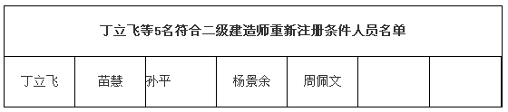根据《注册建造师管理规定》(建设部令第153号)、《一级建造师注册实施办法》(建市〔2007〕第101号)和《吉林省建造师注册实施细则》(吉建管〔2007〕21号)等规定,经审核,丁立飞等5名符合二级建造师重新注册条件,准予重新注册。