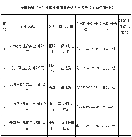 根 据《注册建造师管理规定》《关于建筑业企业项目经理资质管理制度向建造师执业资格制度过渡有关问题补充通知》《关于建筑业企业项目经理资质管理制度向建造 师执业资格制度过渡有关问题的说明》以及《云南省建设厅关于印发〈云南省二级建造师注册实施办法〉的通知》《云南省二级建造师临时执业资格申报及评审实施 细则》的有关规定,按照二级建造师临时执业证书与二级建造师注册证书等同管理的原则,经审核,杨顺法等8人符合二级建造师注销注册条件,准予注销。现通告如下(名单详见附件)。