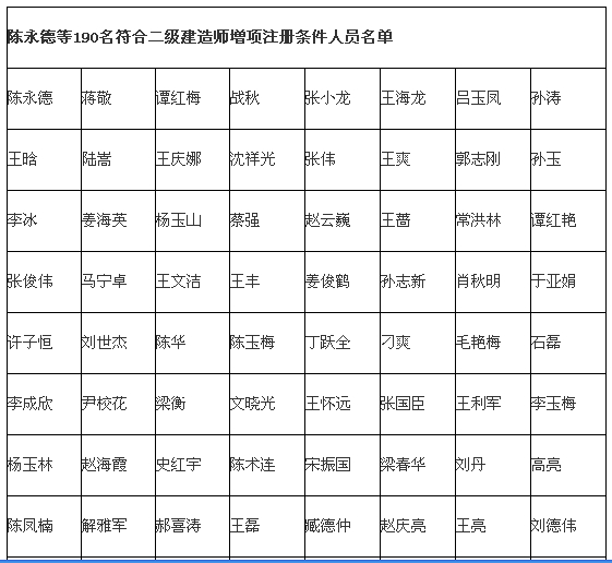 根据《注册建造师管理规定》(建设部令第153号)、《一级建造师注册实施办法》(建市〔2007〕第101号)和《吉林省建造师注册实施细则》(吉建管〔2007〕21号)等规定,经审核,陈永德等190人符合二级建造师增项注册条件,准予增项注册。