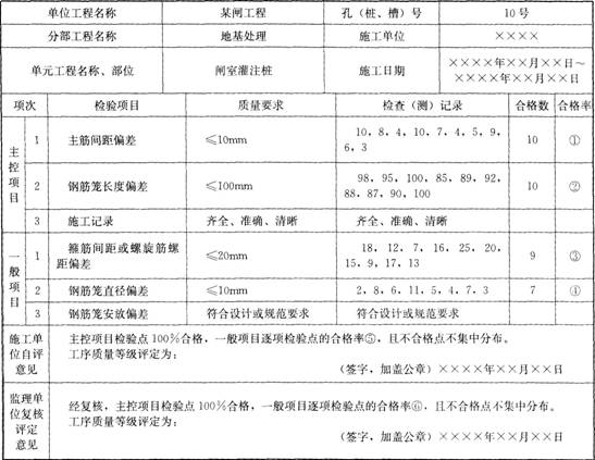 事件四:本工程闸室灌注桩划分为一个单元,工程名称为闸室灌注桩,共计30根,单元工程编号YGT-F02―011。施工单位根据《水利水电工程单元工程质量验收评定标准一地基处理与基础工程》S1 633~2012的规定,对YGT-F02―011的第10号灌注桩,钢筋笼制作安装工序施工质量进行了检查和检测,相关结果填于下表中。