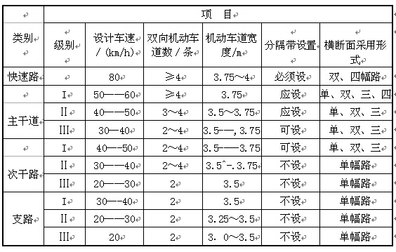 【解析】本题涉及的考点是城市道路的级别与类别。我国城市道路分类、分级及主要技术指标如下表。