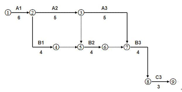 项目部对按上述思路编制的网络计划图进一步检查时发现有一处错误:C2工作必须在B2工作完成后,方可施工。经调整后的网络计划图由监理工程师确认满足合同工期要求,最后在项目施工中实施。