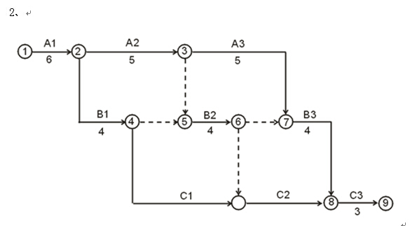 2、发现C2工作必须在B2工作完成后施工,网络计划图应如何修改?(请复制问题1的结果(网络图)到答题纸上作答。在试卷上作答无效)。