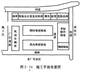 31 A公司总承包某地一扩建项目的机电安装工程,材料和设备由建设单位提供。A公司除自己承担主工艺线设备安装外,非标准件制作安装工程、防腐工程等均要分包给具有相应施工资质的分包商施工。考虑到该地区风多雨少的气候,建设单位将紧靠河边及施工现场的一所弃用学校提供给A公司项目部,项目部安排两层教学楼的一层做材料工具工作,二层作现场办公室,楼旁临河边修建简易厕所和浴室,污水直接排人河中,并对其他空地做了施工平面布置,如图2~14所示。