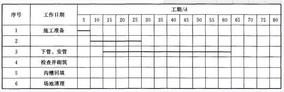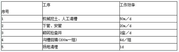 (1)挖土5d后开始下管、安管工作;(2)下管、安管200m后砌筑检查井;(3)检查井砌筑后,按四个井段为一组(200m)对沟槽回填。