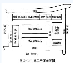 31 A公司总承包某地一扩建项目的机电安装工程,材料和设备由建设单位提供。A公司除自己承担主工艺线设备安装外,非标准件制作安装工程、防腐工程等均要分包给具有相应施工资质的分包商施工。考虑到该地区风多雨少的气候,建设单位将紧靠河边及施工现场的一所弃用学校提供给A公司项目部,项目部安排两层教学楼的一层做材料工具工作,二层作现场办公室,楼旁临河边修建简易厕所和浴室,污水直接排人河中,并对其他空地做了施工平面布置,如图2~14所示。