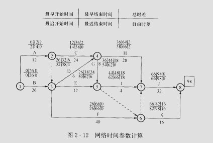 1.根据图2-12,原始方案的关键路线和计算工期: