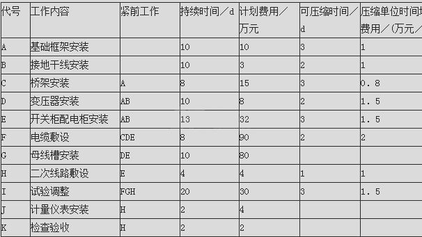 安装公司项目部进场后,依据合同、施工图、验收规范及总承包的进度计划,编制了变配电工程的施工方案、进度计划,劳动力计划和计划费用。项目部施工准备工作用去了5d。当正式施工时,因商场需提前送电,业主要求变配电工程提前5d竣工。项目部按工作持续时间及计划费用(见下表)分析,在关键工作上,以最小的赶工增加费用,在试验调整工作前赶出了5d。
