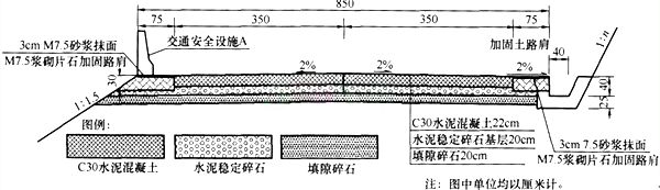 某施工单位承接了长42.5kin的山区二级公路路面施工,路线右侧濒临花溪河,属于沿溪线,河流的常水位3~4m深。路面结构如下图所示。