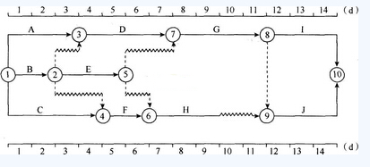 本题涉及的考点是双代号时标网络计划时间参数的计算。本题的关键线路为A→D→G→I,A→D→G→J。所以工作G为关键工作,工作F为非关键工作。双代号网络计划中,以终点节点为完成节点的工作,其总时差应等于计划工期与本工作最早完成时间之差。其他工作的总时差等于其紧后工作的总时差加本工作与该紧后工作之间的时间间隔所得之和的最小值。故工作E的总时差=min{(O+2),(2+1))=2(d),工作B的总时差=min{(0+1), (2+0),(2+2)}=1(d);工作C的总时差为2 d。